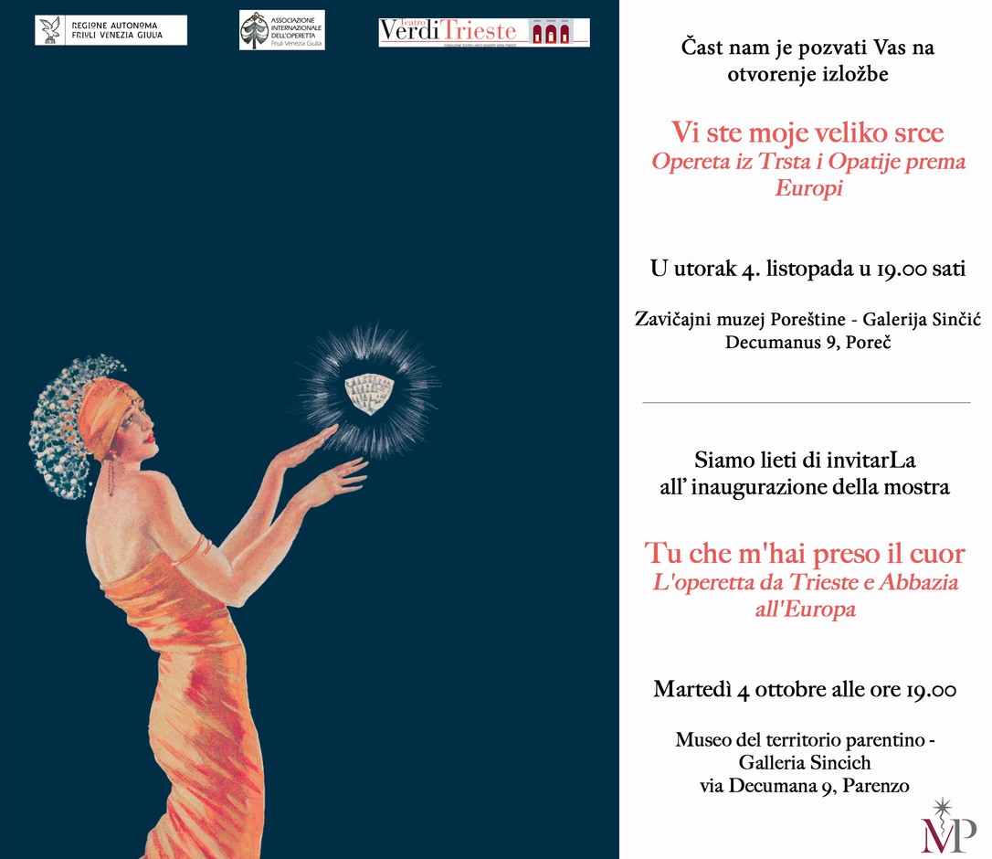 Međunarodna operetna udruga – Friuli Venezia Giulia iz Trsta (Associazione internazionale dell'operetta - Friuli Venezia Giulia) u suradnji sa Zavičajnim muzejem Poreštine u porečkoj Galeriji Sinčić postavljaju izložbu o povijesti operete pod nazivom „Vi ste moje veliko srce ̶ Opereta iz Trsta i Opatije prema Europi“ / „Tu che m'hai preso il cuor – L'operetta da Trieste e Abbazia all'Europa“.